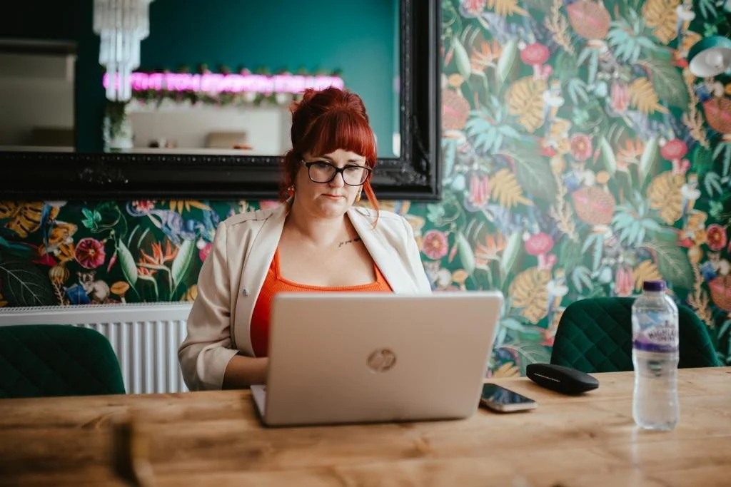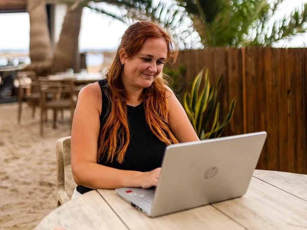 A woman with long red hair wearing a sleeveless black top, sitting at a wooden table outdoors, working on a silver laptop.